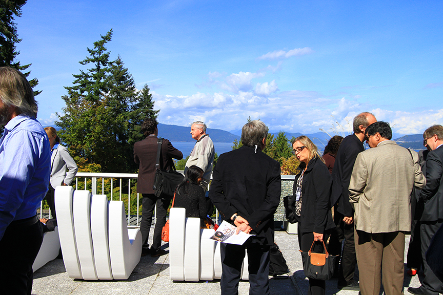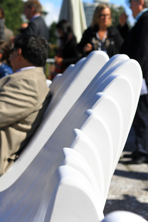 I Hear You Say is located on the terrace at the Peter Wall Institute and is open to the public. The Institute invites visitors to recline on the installation and converse while contemplating English Bay and the Coast Mountains beyond. Credits: I Hear You Say was designed byAFJD Studio